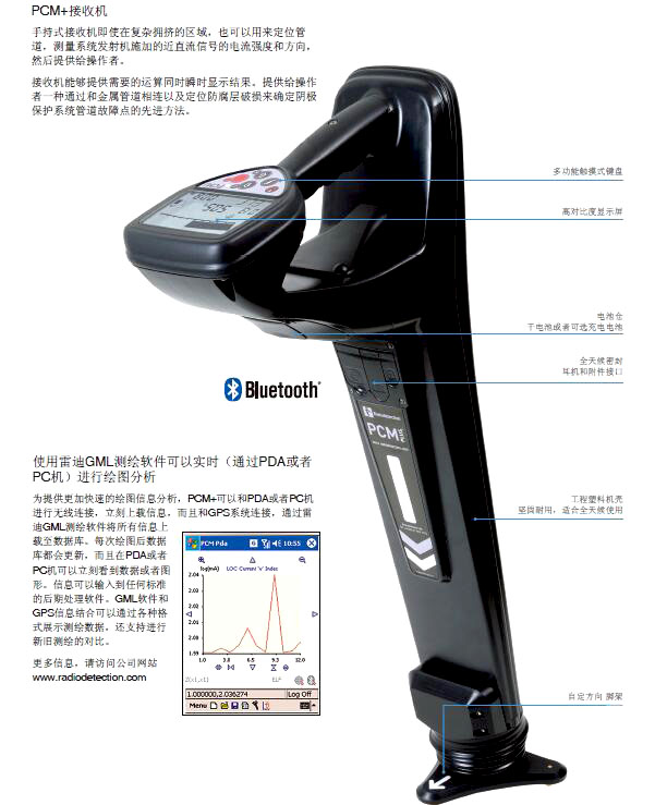 PCM Plus+PCM +系统包括一个便携式发射机及手持式接收机。发射机和CPS站点连接,可以向管道施加一个特殊的近直流信号。接收机可以在最大30公里(19英里)的范围内定位这种特殊信号来识别管道的位置和深度.一旦管道被定位,技术人员就可以绘制沿管道的泄漏电流图,显示出信号电流大小和方向,从而迅速的确定防腐层破损.确定了管道的破损段之后,使用A字架,可以进一步将破损位置和深度确定在1米(3英尺)的范围内。
