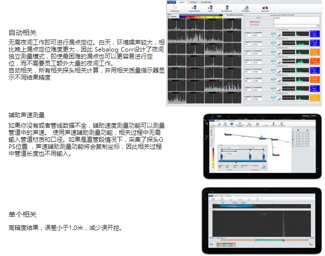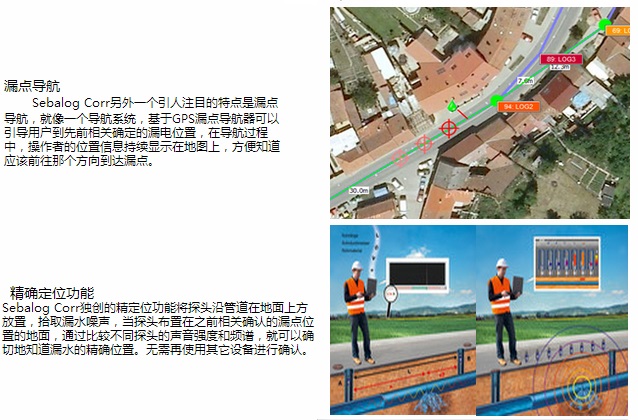 Sebalog Corr N3用于供水管道漏水检测。 承压水在漏点位置产生振动形成噪声并沿管道方向向两边传播,由安装在阀门、消防、水表等位置的传感器(压电陶瓷传感器、水听传感器)记录、放大并通过无线方式传输给主机,通过比较两个信号,并相关计算时间差,从而计算出漏水点的精确位置。