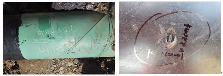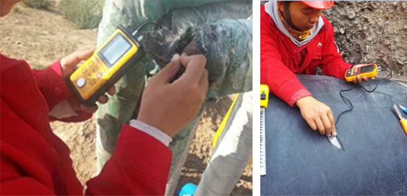 电火花检漏检测:按照标准要求,根据不同防腐层标准的厚度要求,计算检漏电压为15kV,采用电火花检漏仪进行检测,记录漏点数及漏点分布情况、裂纹、剥离等现象。